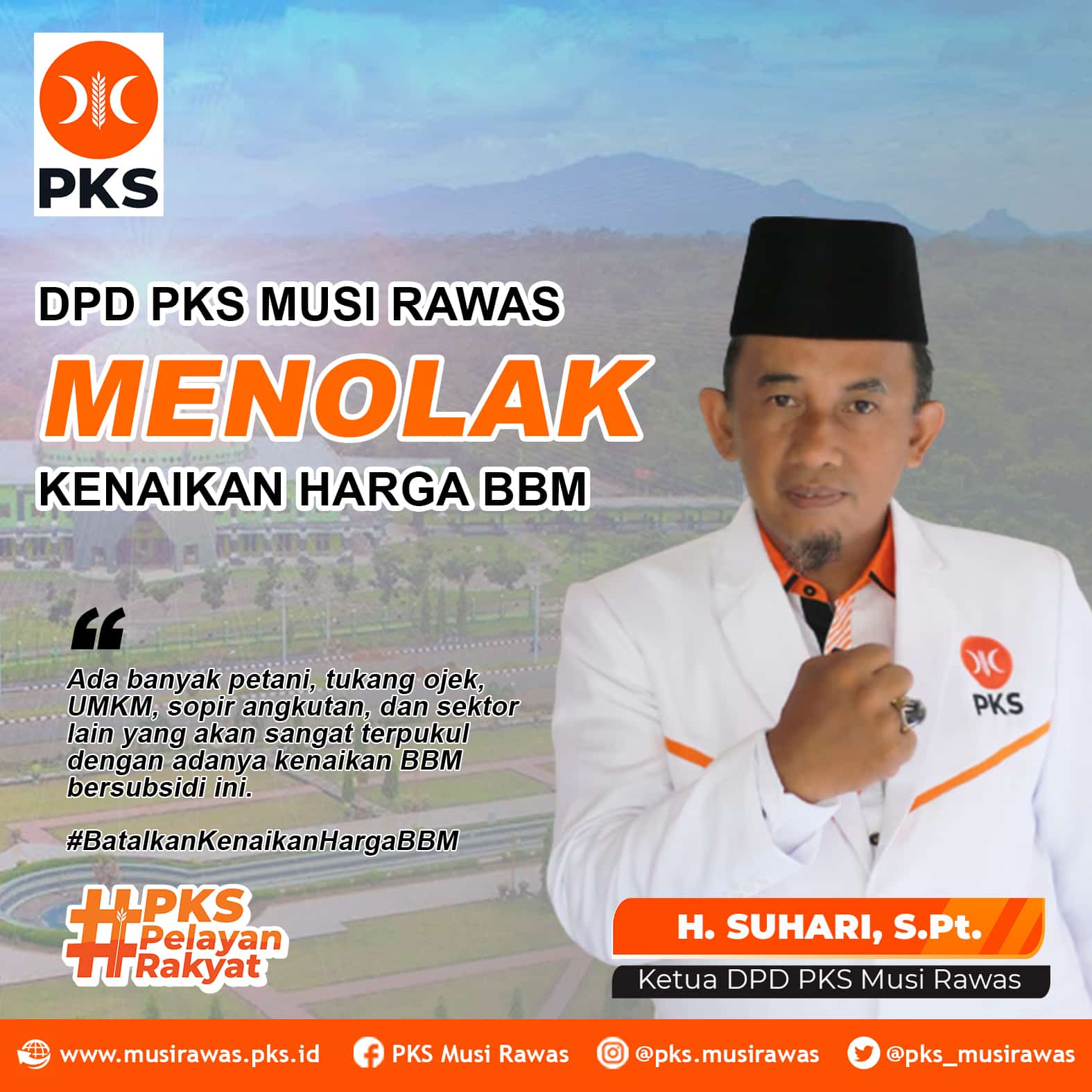 “Kami menolak tegas kebijakan pemerintah yang menaikan harga BBM,” terang Ketua DPD PKS Musi Rawas, H. Suhari, S.Pt., Selasa (6/9/2022).